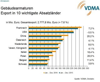 2016 exportierte Deutschland Gebäudearmaturen im Wert von insgesamt 2,77 Milliarden Euro. Das sind 7,6 Prozent mehr als im Vorjahr. Die Liste der Top-10 Absatzländer für deutsche Gebäudearmaturen wird von Frankreich, USA und China angeführt. Den größten Zuwachs konnten dabei die Exporte nach China verzeichnen (plus 20,2 Prozent). Dem selbstverordneten Wachstumskurs folgend und gestützt von staatlichen Investitionsprogrammen, platzierte sich China damit, vor Österreich, auf Rang 3 der wichtigsten Absatzländer deutscher Gebäudearmaturen, so der Fachverband. Die USA liegen immer noch auf Platz 2 der Rangliste, obwohl die Exporte 2016 um 0,5 Prozent zurückgingen. Grund dafür sei u. a. die schwache Entwicklung der US-Wirtschaft gewesen.