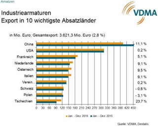 2016 erzielten die deutschen Industriearmaturenhersteller ein Exportvolumen von 3,6 Milliarden Euro, dies ist ein Plus von 2,8 Prozent im Vergleich zum Vorjahr. Erfreulich seien die Ausfuhren ins europäische Ausland gewesen. Besonders Tschechien (plus 23,7 Prozent), Österreich (plus 9,5 Prozent) und die Niederlande (plus 9,1 Prozent) legten zu. Auf der Liste der Top-10 Absatzländer landete Frankreich auf Rang 3 mit 191,5 Mio. Euro (plus 5,1 Prozent). Hier sei das verbesserte Investitionsklima und die wachsende Chemiewirtschaft zu Buche geschlagen. Den ersten und zweiten Platz nahmen China und die USA ein. Der Export in das wichtigste Abnehmerland deutscher Industriearmaturen ging dabei erneut zurück (minus 11,1 Prozent) auf 402,5 Millionen Euro. Chinas Chemiebranche kämpfe mit schwacher Nachfrage, ineffizienten Produktionsstrukturen und geringer Investitionsbereitschaft. In der zweiten Jahreshälfte zog die gesamtwirtschaftliche Dynamik in den USA wieder an. Dies könnte US-Firmen dazu veranlassen, ihre Investitionsplanungen umzusetzen. Auch in der US-Öl- und Gaswirtschaft haben sich die Aussichten zuletzt aufgehellt. Die Lieferungen der deutschen Hersteller in die USA konnten dementsprechend im Vergleich zum Vorjahr einen schwachen Zuwachs verzeichnen (plus 0,2 Prozent).