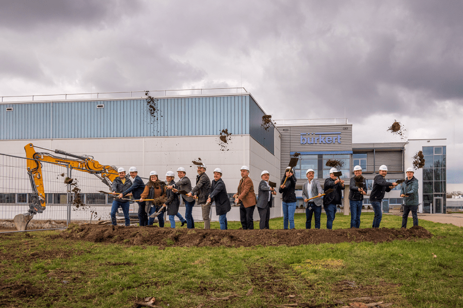 Eine neue Produktionshalle und eine Erweiterung des Logistikbereichs entstehen am Bürkert-Werk in Öhringen. Nach ersten Erdarbeiten im Januar startete mit dem offiziellen Spatenstich nun der Bau der neuen Gebäude. Mit den neuen Flächen werden die bestehenden Lagerkapazitäten erweitert sowie interne Arbeitsabläufe optimiert und automatisiert. Die Neubauten umfassen eine zusätzliche Nutzfläche von 5.800 Quadratmetern – rund 60 Prozent nimmt die Produktion ein und ca. 40 Prozent die Bürkert-Logistik.